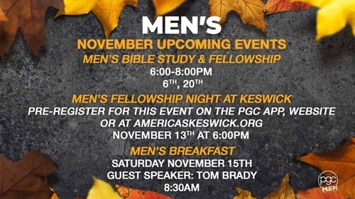 PGC Men meet every Thursday night at 6pm. We meet in the PGC Fellowship room from 6-8pm for Bible Study and fellowship on the 1st, 3rd, 4th, (and 5th) Thursday of each month. On the 2nd Thursday of each month, instead of meeting at PGC, we head over to America's Keswick (601 Route 530, Whiting, NJ) for their fellowship night from 6-10:30pm.