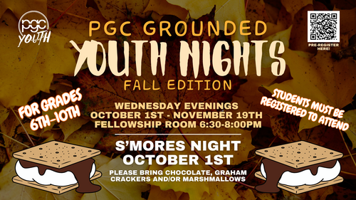 October 1st we are launching our Fall season of PGC Grounded Youth Nights with a S'MORES NIGHT! Join us at 6:30pm in the PGC Fellowship Room as we kick off the Fall Season making S'more Kits for the Lakehurst Fire Department's upcoming fundraising event and then end the night making some of our own yummy treats around a campfire (weather permitting).
