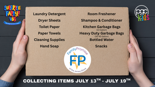 This Summer we are teaming up with Family Promise of the Jersey Shore to provide household and hygiene essentials to help stock their day houses. All week long, we will be collecting the items listed above. Our VBS kids will go head-to-head competing for one last BIG surprise for their group leader, and who knows maybe even a certain Pastor! Whoever collects the most items will be the winner!